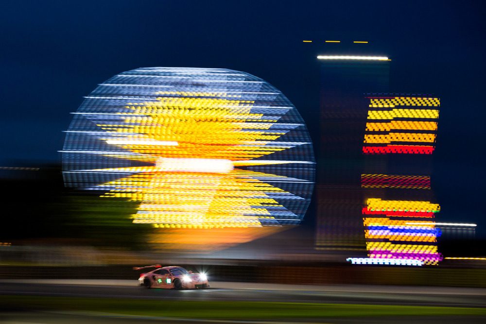 It’s race time: At more than 300 km/h, the Porsche 911 RSR hurtles down the D338 road from Le Mans towards Tours. The two chicanes, which are closed off for everyday traffic are a favourite spot for speed cameras. The ca. 515-hp GTE sports car takes the kerbs hard. Then, as fast as possible through the Mulsanne Corner and Indianapolis to the famous Arnage – the slowest passage of the 13.626-kilometre Circuit des 24 Heures.